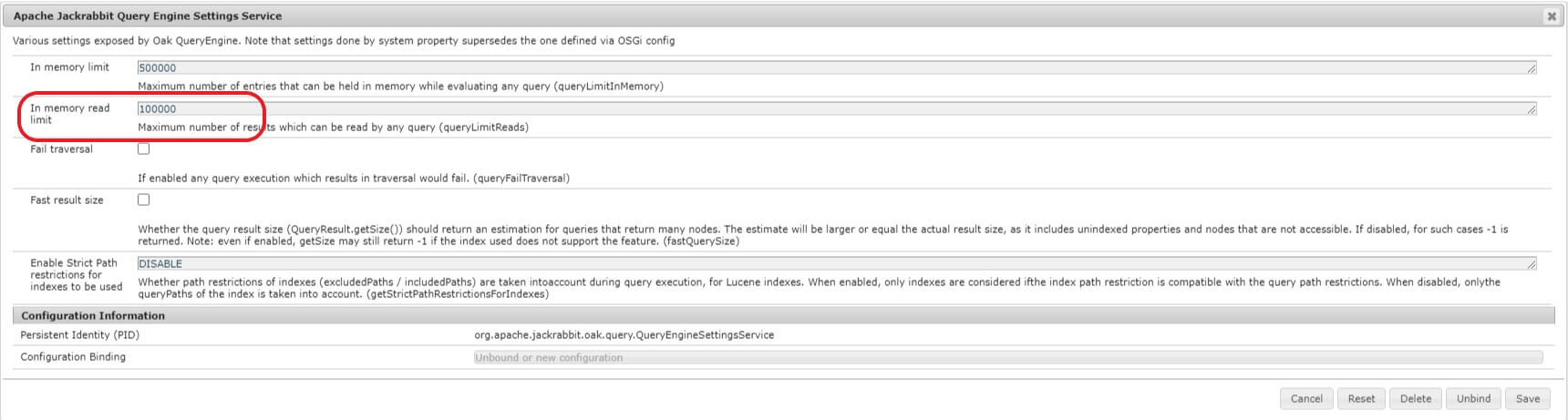 Then search for “Apache Jackrabbit Query Engine Settings Service“. And click on that. You will see something like shown below.